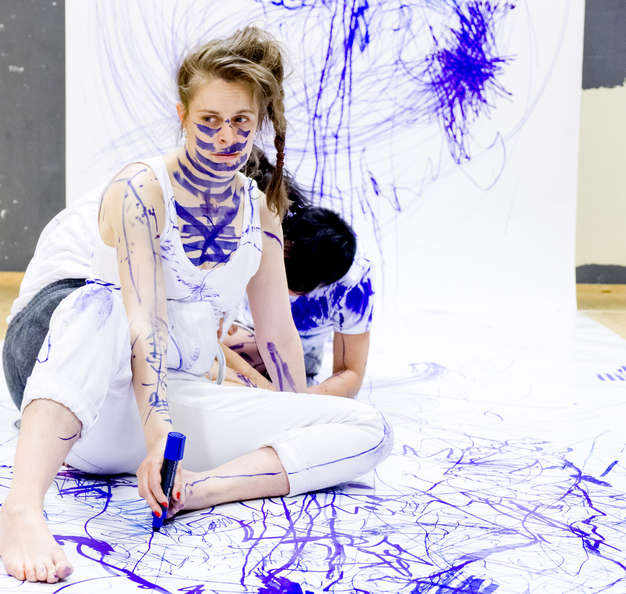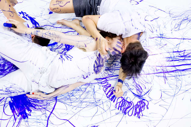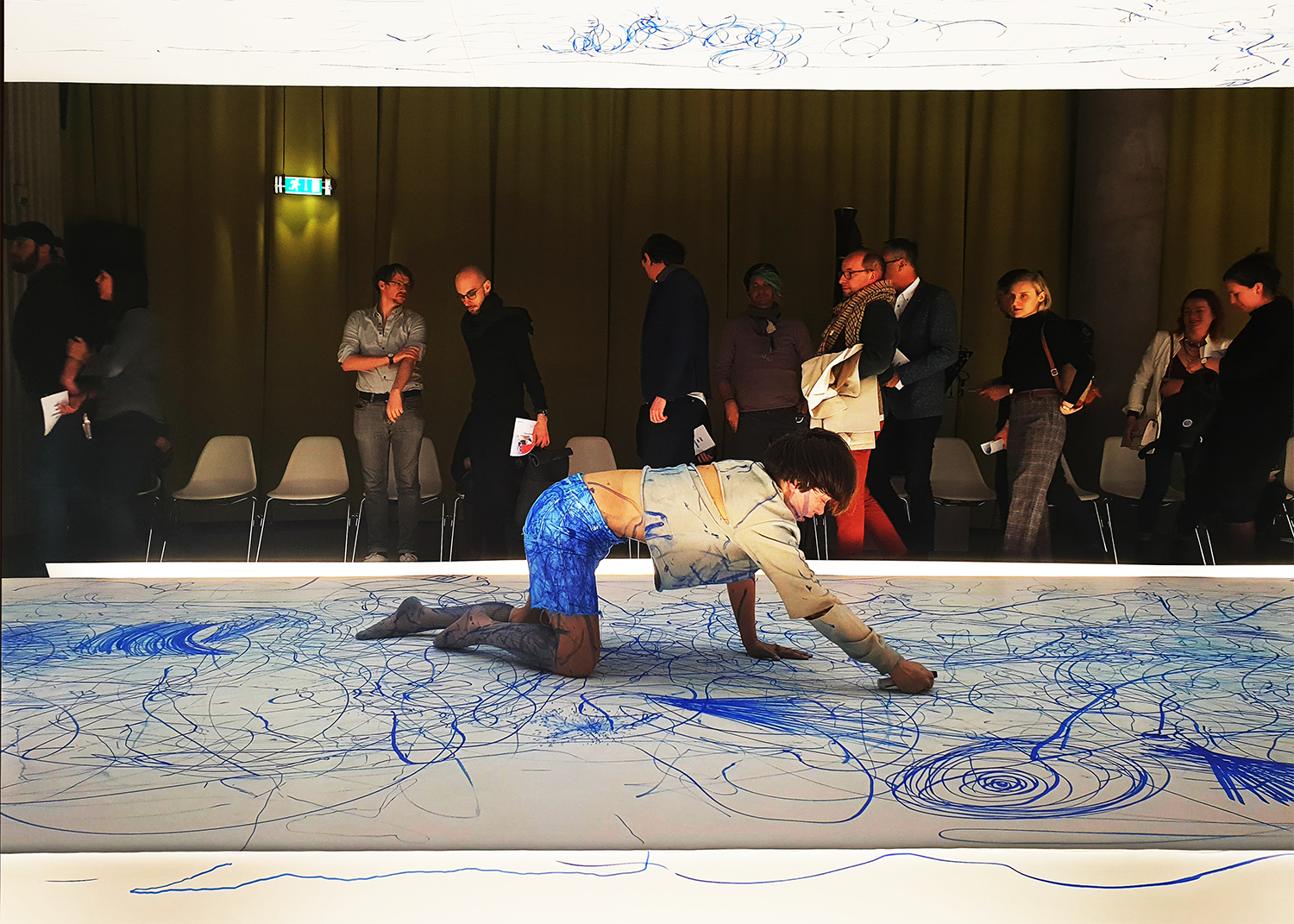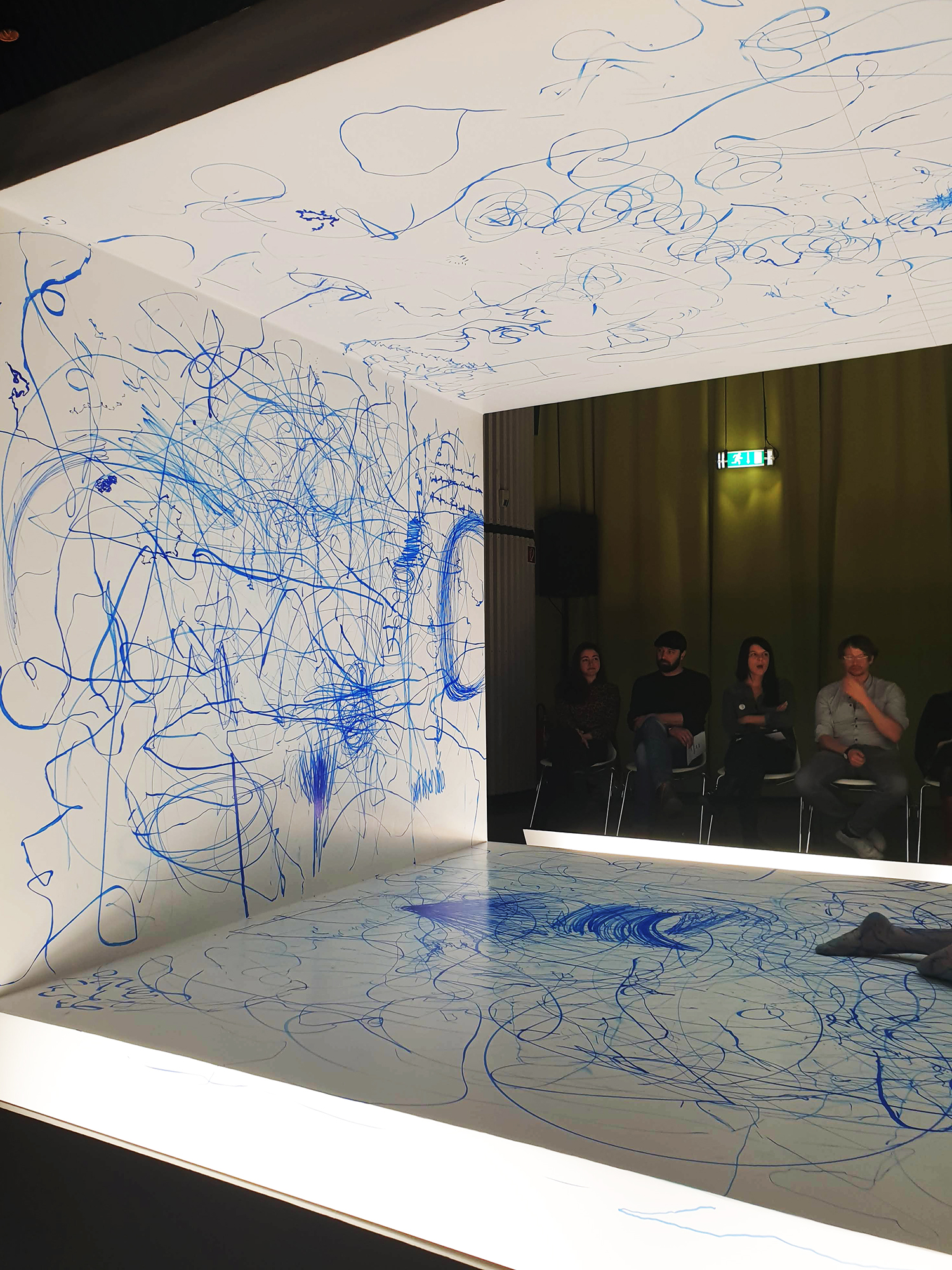 As the show played, the performers drew on walls, their bodies, or just plain air. Basically no surface was off limits. They were accompanied by a harp and electronics which music to which the performers danced and drew. At times however, the influence came from the performers, which was reflected in the music the 2 musicians were playing. This repetition was sometimes a hypnotic sight. Marta explains her idea of the performance as a kind of a surreal experience, a dream. During the series of 5 performances, the paper walls were left untouched, reflecting past sessions and getting more and more blue. At the end of the series the paper was removed.